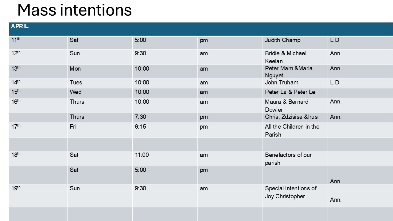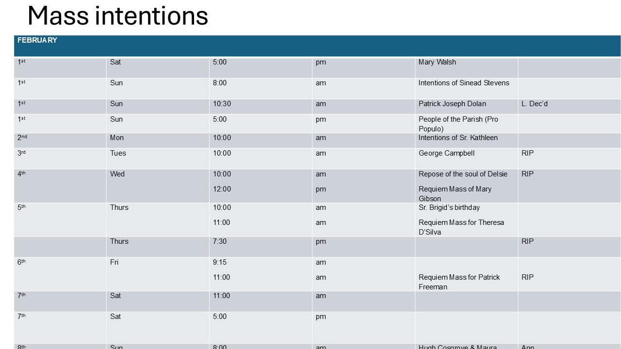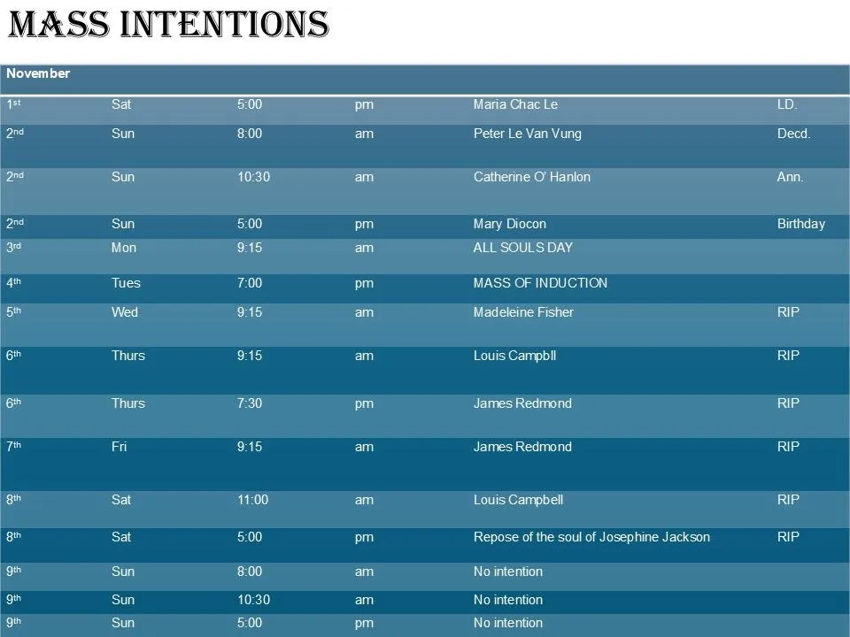 We continue to have many unassigned masses in the coming weeks - this is a beautiful way to pray for your loved ones, living or deceased. If you would like to request a Mass intention, please speak to me or contact the Parish office.